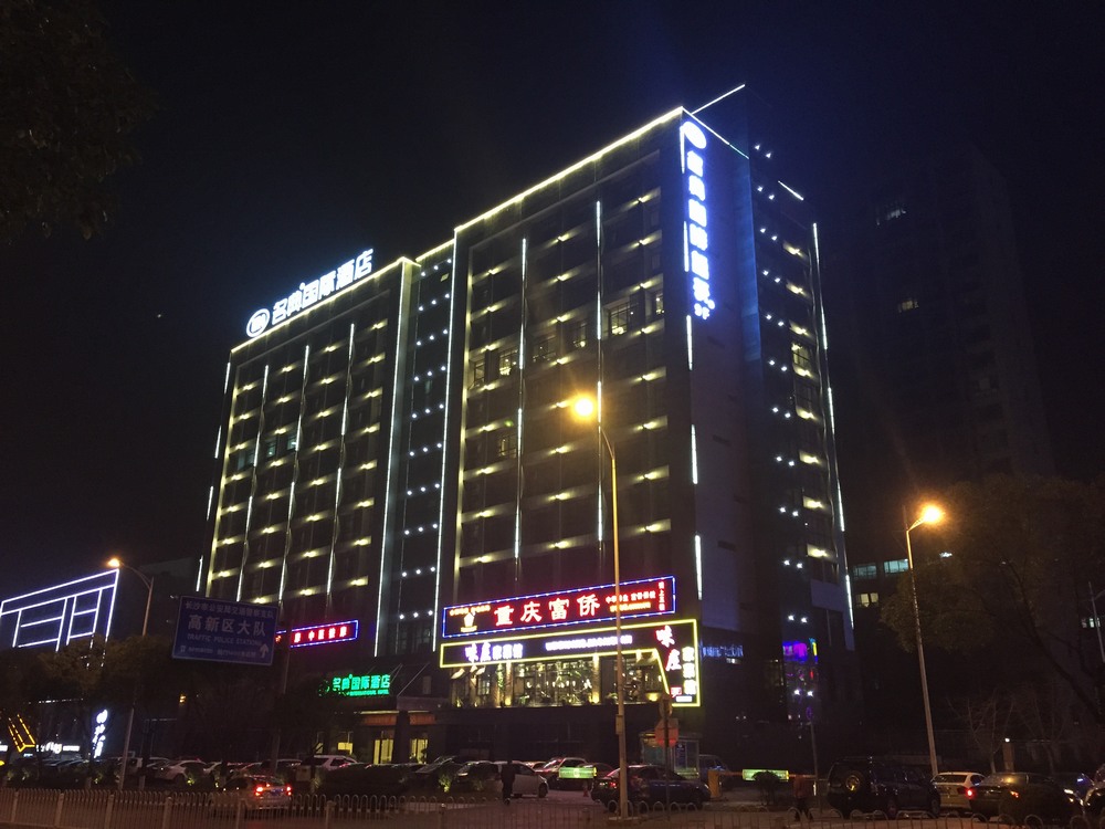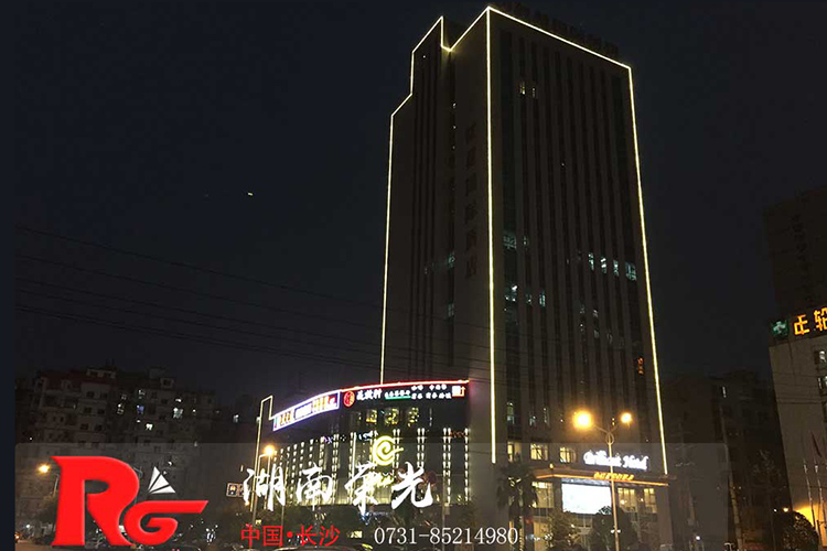 長沙酒店亮化 戶外亮化設(shè)計(jì) LED夜景亮化安裝及施工工程采用IP 65防護(hù)等級(jí)的LED線條燈,十字星光燈搭配設(shè)計(jì)。燈具色溫采用冷、暖色搭配設(shè)計(jì),主線條燈勾勒出建筑亮化的輪廓,采用暖色星光燈營造長沙酒店亮化的溫馨氛圍。